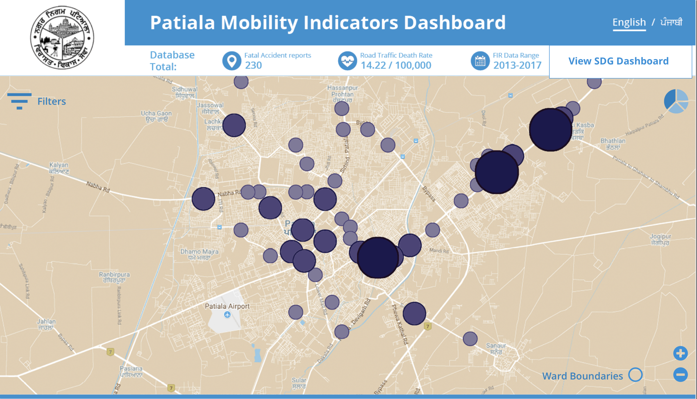 Avalon, along with the Community Systems Foundation’s OpenCities Institute, developed the Bulandshahr Mobility Indicators Dashboard to address road safety in Patialia, India. Considering road safety is a major concern in India, as traffic deaths are five times higher than some best performing countries, Community Systems Foundation partnered with the Transportation Research and Injury Prevention Programme (TRIPP), International Association of Traffic and Safety Sciences (IATSS) and the Sustainable Development Solutions Network (SDSN) to engage local leaders in the localization of the Sustainable Development Goals (SDGs). By mapping local priorities to the SDGs, citizens of Patiala, India were able to better understand what the Global Goals look like in local contexts. Once live, the mobility indicators dashboards would enable local decision-makers to create necessary interventions that would would combat road traffic deaths.